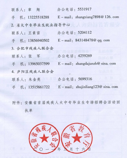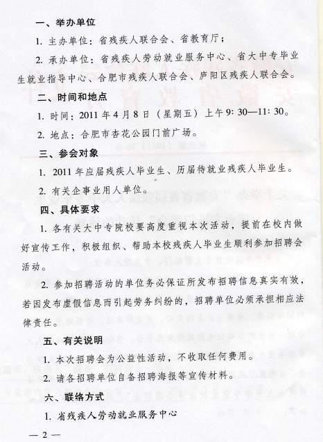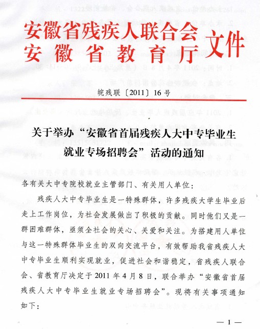 关于举办“安徽省首届残疾人大中专毕业生就业专场招聘会”活动的通知