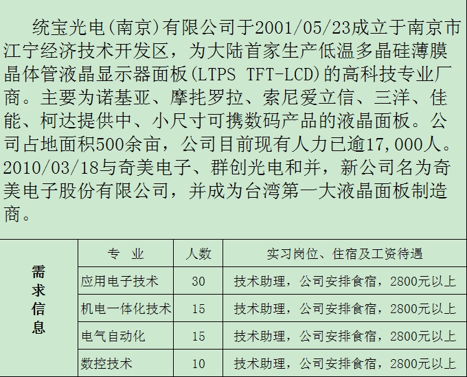 统宝光电(南京)有限公司招聘启事
