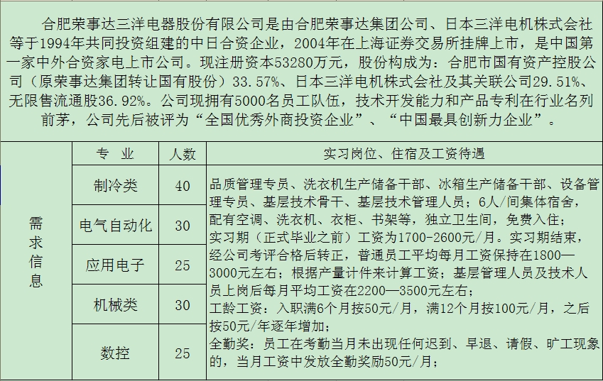 合肥荣事达三洋电器股份有限公司招聘启事