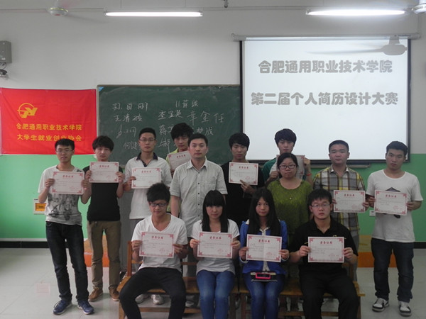 5月28日下午,由我院就业工作办公室主办,院大学生与就业创业协会承办的合肥通用职业技术学院第二届大学生个人简历设计大赛在教学主楼304教室隆重举行。本次比赛得到了青岛海信日立空调系统有限公司和院团委的大力赞助与支持,院团委书记甄君亲临大会并担任大赛主评委。制冷1101班胡优德同学荣获一等奖;模具1202班的薛诚和计应1101班蒋高云荣获二等奖;应电1101班孙自刚等9人分获三等奖。